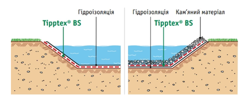 5. При організації штучних водойм та гідроспоруд різного призначення, занурених у землю резервуарів для зберігання побутового, промислового або іншого сміття теж рекомендується укладати геотканину. Вона мінімізує тертя між гідроізоляційним шаром та підсипним матеріалом, що суттєво продовжує термін служби загальної конструкції. Тут важливо правильно вибрати матеріал за показником граничної міцності, так як навантаження на нього буде серйозним.